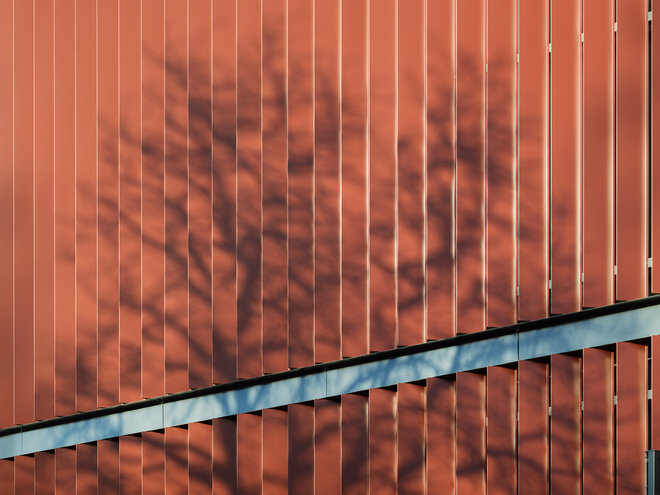 The reddish-brown tone of the facade is an abstract reminiscence of the classic buildings of the industrial age, while the form and use of the material are clearly contemporary and give the building its own unique character.