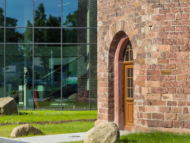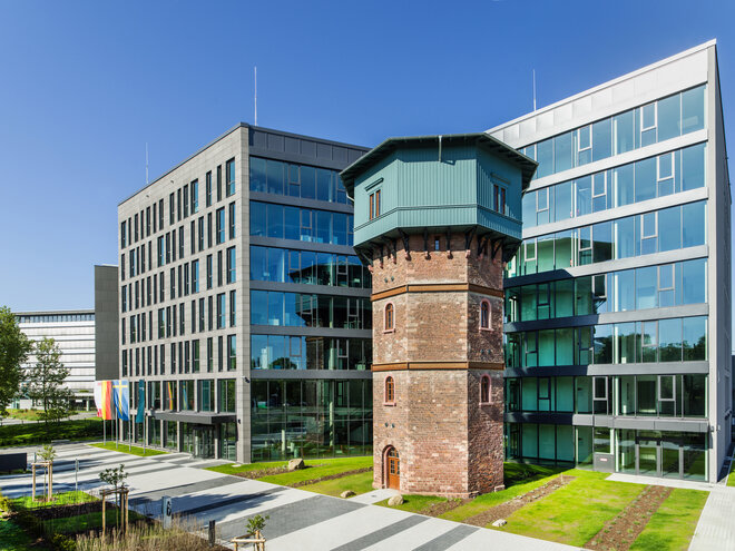 The reinforced concrete structure, planned as a massive building, consists of flat slabs supported at points, bracing walls in defined cores and a facade supported by reinforced concrete columns. The 2-story reception foyer is defined by a self-supporting glass facade facing the listed water tower.
