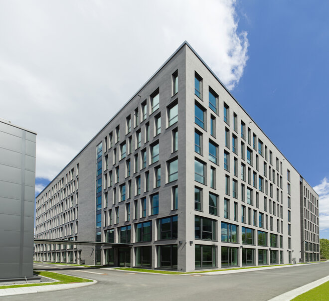 The 7-storey office building with a technical floor on the roof will be built in two construction phases. The two building sections are each grouped around an inner courtyard. The company headquarters is entered via a spacious foyer on the first floor of the office building. From here, there is access to meeting rooms, the staff canteen and a showroom, as well as elevators and stairs to office floors 1-6 and the technical floor on the roof.