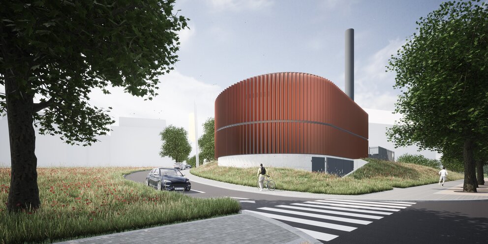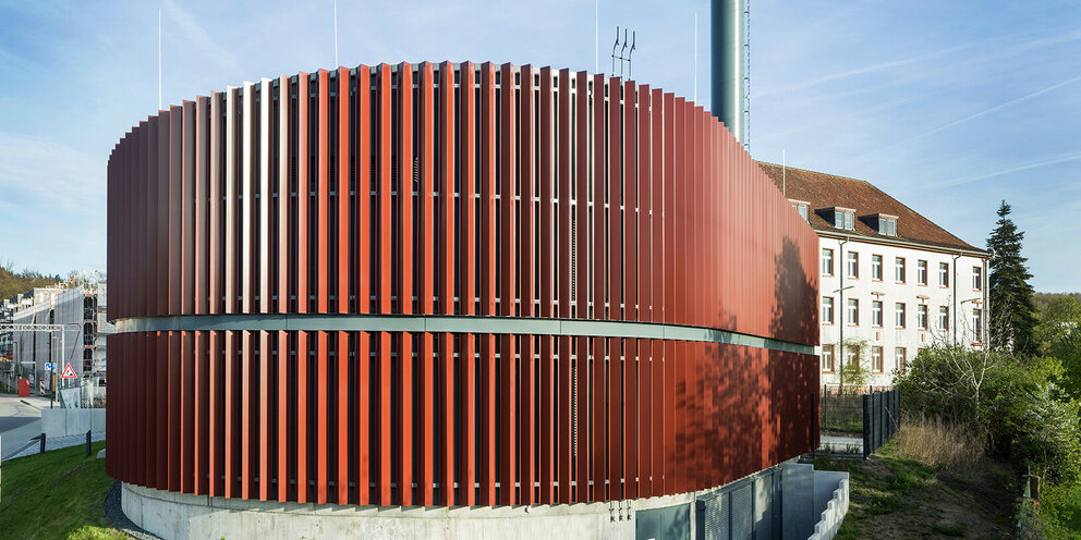 Zur Versorgung des neuen Wohngebiets Ludwigshöhviertel im Süden Darmstadts baut die entega AG auf einem prominenten Grundstück an der Zufahrt zum Quartier eine neue Energiezentrale. Das Grundstück liegt in einem spitzen Winkel zwischen der Ludwigshöhstraße und der Einmündung der Granitstraße.
