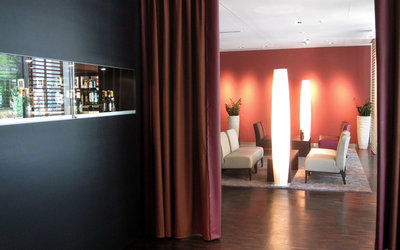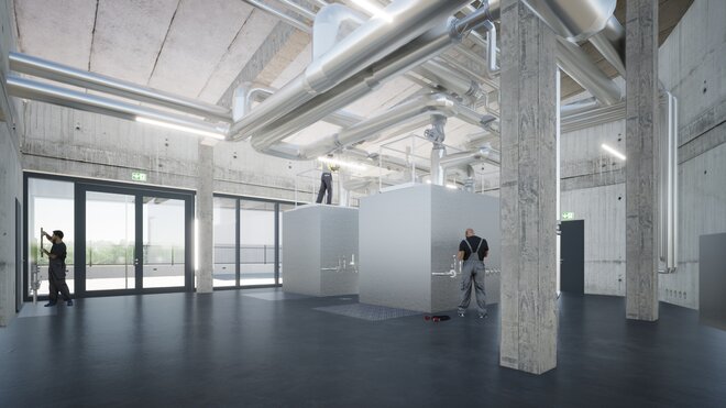 Der Eingangsbereich liegt abgeschirmt auf der von der Straße abgewandten Seite und wird bestimmt durch einen Einschnitt in das Gebäudevolumen und eine große Glasfassade, die zum Zweck des Anlagentauschs revisionierbar ist. Sie dient der natürlichen Belichtung des Gebäudes und erlaubt einen Blick auf die Anlagentechnik, um die Funktion des Gebäudes sichtbar zu machen.