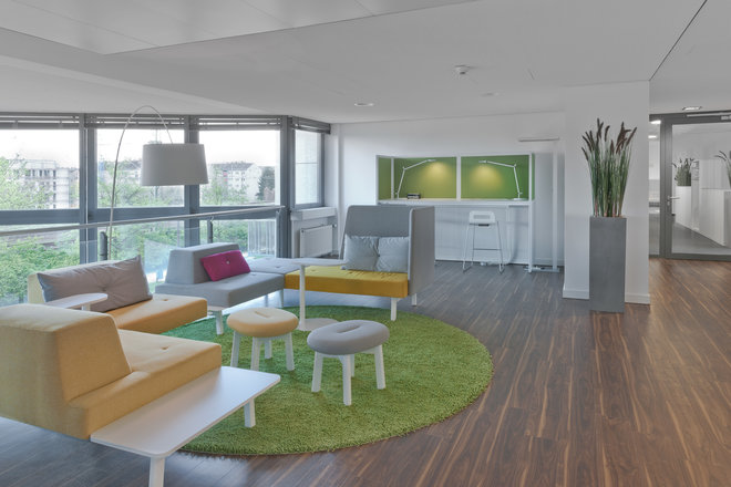 Im Zuge der Modernisierung wurden darüber hinaus sämtliche Foyer- und Erschließungsflächen zu Aufenthalts- und Arbeitsbereichen aufgewertet und gestalterisch entsprechend ausformuliert. Diese Umnutzung wurde ermöglicht durch eine neue brandschutztechnische Bewertung der Flächen und eine geänderte Rettungswegführung.