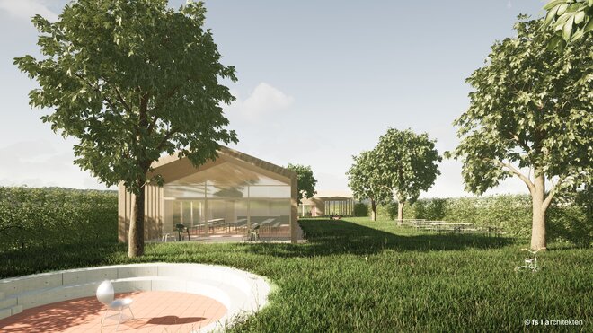 Die geplante Nutzung umfasst einen wettergeschützten Veranstaltungsraum mit Ausgabetheke, eine kleine Küche, WC-Anlagen und Nebenräume für Lagerung und Technik. Der Innenraum lässt sich mittels Schiebeelementen zu der Außengrillstelle und dem Feuerplatz großflächig öffnen.