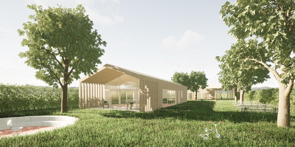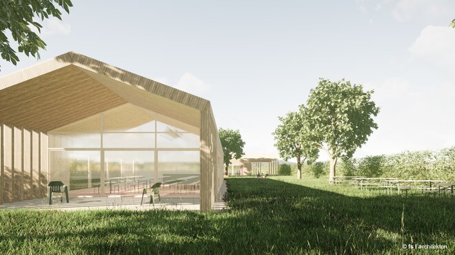 Der einfache rechteckige Baukörper mit Sparrendach ist in Holzbauweise geplant und öffnet sich an der Stirnseite zu einer großzügigen überdachten Veranda, die auch bei ungünstiger Witterung genutzt werden kann. Großzügige Glasflächen sorgen für eine gute Belichtung des Innenraums.