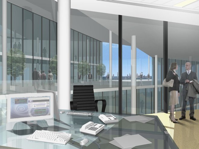 Auf der nordorientierten Fassade ist der Einsatz von hochwärmedämmendem Glas denkbar, um in Kombination mit der Pufferwirkung des Atriums die Wärmeverluste auf ein Minimum zu reduzieren. Im Sommer könnte ein zusätzlicher Kühleffekt des Gebäudes durch Wasserflächen innerhalb des Atriums und nächtlicher Durchlüftung entstehen. Auf dem Dach des Gebäudes stehen ca. 3.000 qm Fläche zur Gewinnung von Sonnenenergie zur Verfügung.