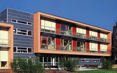 Durch eine dreischiffige Gliederung des Baukörpers wird die Gebäudefront in drei wohlproportionierte Gebäudeelemente gegliedert. Diese Elemente werden straßen- und hofseitig mit Backsteinen verkleideten vorgestellten „Scheiben“ abgeschlossen. Im Zuge der hinter diesen Scheiben liegenden Schicht wird der Baukörper als Ganzes abgeschlossen. Diese so genannte zweite Schicht wird als Putzfläche mit geschosshohen Fenstern ausgeführt, während die Flächen zwischen den Baukörpern straßen- und hofseitig verglast werden.